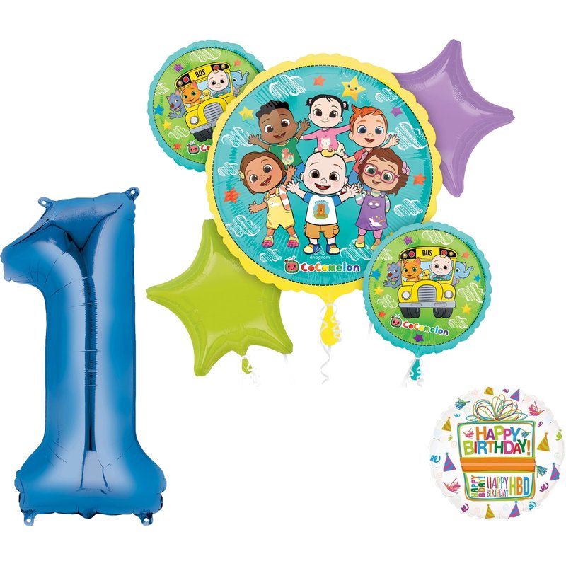 - (1) 28" Round CoComelon Foil Balloon, (1) 34" Giant Blue Number 1 Foil Balloon, (2) 17" Round CoComelon Foil Balloons, (1) 18" Mayflower Products Happy Birthday Present Foil Balloon, (2) 19" Heart Shape Foil Balloons 1- Lilac, 1- Lime Green. Ribbon Not Included. All Anagram Licensed Balloons are Made in USA. Founded in 1977, Anagram International leads the world in innovating and manufacturing foil balloons.