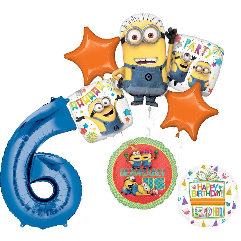 - (1) 34" Giant Blue Number 6 Foil Balloon, (1) 17" Despicable Us Round Foil Balloon, (1) 25 inch Waving Minion Foil Balloon, (2) 17" Minions Square Party Balloons, (2) 19 inch Orange Star Foil Balloons and (1) 18" Mayflower Products Happy Birthday Present Foil Balloon. Ribbon Not Included. All Anagram Licensed Balloons are Made in USA. Founded in 1977, Anagram International leads the world in innovating and manufacturing foil balloons.