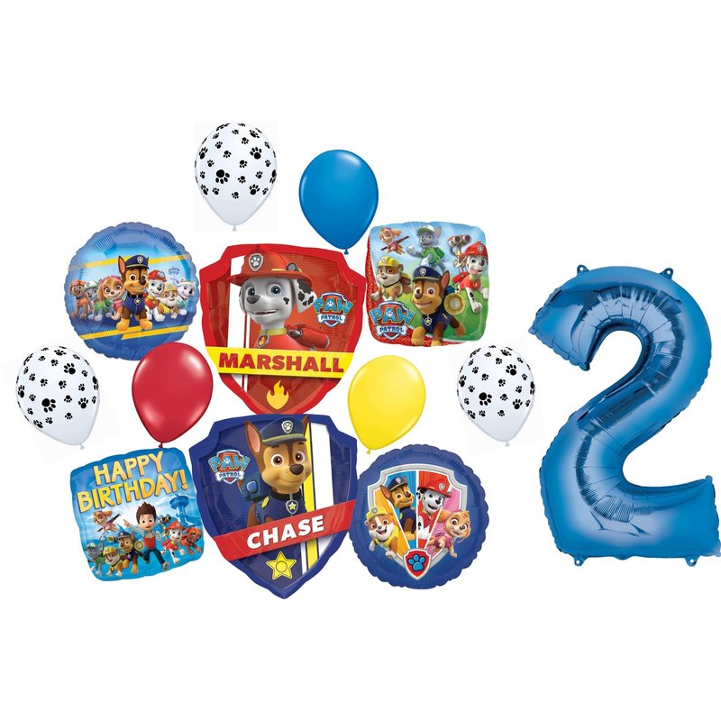 - (1) 34" Giant Blue Number 2 Foil Balloon, (1) 27" Two Sided Chase and Marshall Badge Foil Balloon (image shows both sides of the balloon), (2) 17" Square Characters Foil Balloons 1 Happy Birthday, (2) 17" Round Characters Foil Balloons and (6) 11" Latex balloons 1- Blue, 1- Yellow, 1- Red and 3 White with Black Paw Print. Ribbon NOT Included. All Anagram Licensed Balloons are Made in USA. Founded in 1977, Anagram International leads the world in innovating and manufacturing foil balloons.