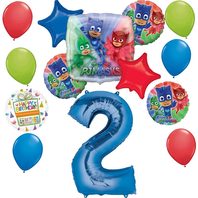 - (1) 28" Jumbo PJ Masks Panoramic Foil Balloon, (1) 34 Giant Blue Number 2 Foil Balloon, (3) 17" PJ Masks Round Characters Foil Balloons, (2) 19" Star Shape Foil Balloons Red and Blue, (6) 11" Latex Balloons 2- Lime Green, 2- Blue and 2- Red and (1) 17" Round Mayflower Products Happy Birthday Present Foil Balloon. Ribbon Not Included. All Anagram Licensed Balloons are Made in USA. Founded in 1977, Anagram International leads the world in innovating and manufacturing foil balloons.