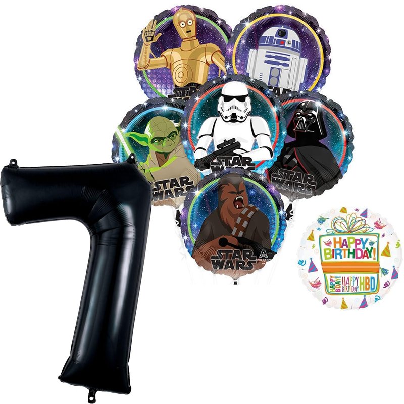- (6) 17" Star Wars 2 sided Foil Balloons featuring Darth Vader, Chewbacca, Yoda, R2D2, C3PO and Stormtrooper, (1) 34" Giant Black Number 7 Foil Balloon and (1) 18" Mayflower Products Happy Birthday Present Foil Balloon. Ribbon Not Included. All Anagram Licensed Balloons are Made in USA. Founded in 1977, Anagram International leads the world in innovating and manufacturing foil balloons.