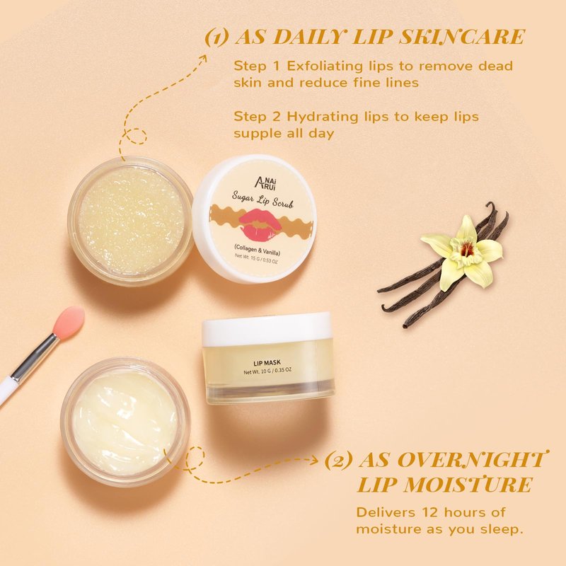 - Lip Dual Care For Your-- ANAI RU vanilla & collagen lip therapy set combined lip care products includes lip scrub and lip sleeping mask, work to intensive moisture and wake up to healthier-looking lips, naturally derived mica for a hint of shine to lips.