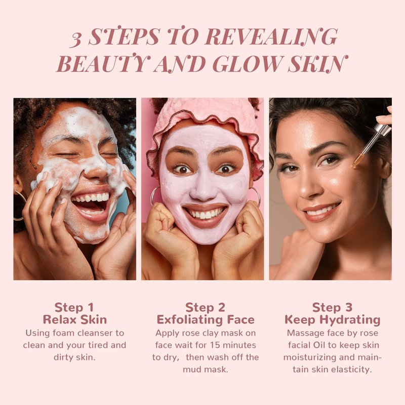 - Purify & Hydrate Face Set: If you find a face washing & moisturizing set for your face, our rose facial kits are ideal. Face mousse cleanser helps to wake up and soothe sleeping skin. Pink clay mask works to purify and soften your face. Squalane oil enables to moisturize and supple your skin. A perfect skincare set for women at home, face spa, and travel.