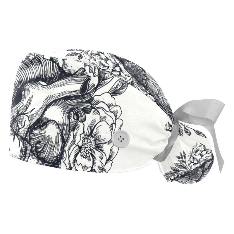 Anatomical Heart with Flowers Scrub Caps Hats Women Bouffant Working Hat Ponytail Holder for Women Long Hair Covers 2PCS