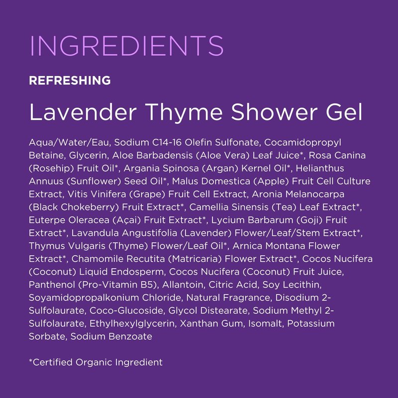 - Inspired By Nature: Refreshing lavender and thyme delight the senses as superfruit antioxidants and ultra-hydrating aloe vera help protect skin's moisture barrier for an invigorating, all-over body treatment
