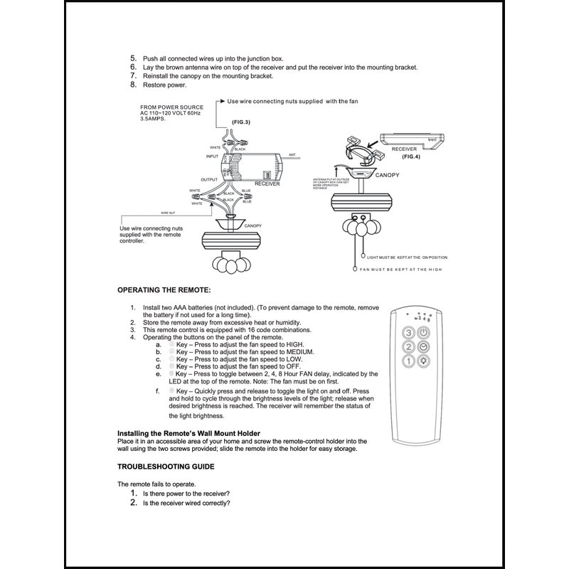 - Features: - Fan speeds: Off, low, med, high - Power - Fan Time delay - Light on/off/dimming - Works lights with Incandescent, LED, CFL and E-Ballast bulbs - Requires two (2) AAA batteries (not included)