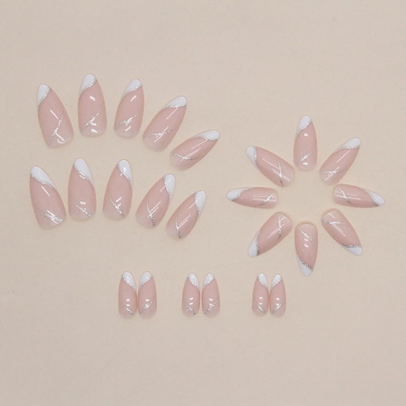 - ANDGING French Tip Press on Nails Almond Short White Fake Nails with Silver Curved Line Design Gel Glue on Nails for Women Acrylic False Nails with Glue Full Cover Stick on Nails for Wedding Birthday
