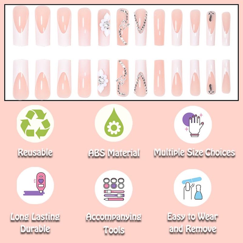 - ANDGING French Tip Press on Nails Long Square White Fake Nails with Rhinestone Butterfly Flower Design Glue on Nails for Women Girls Acrylic False Nails with Glue Gel Stick on Nails for Birthday DH66