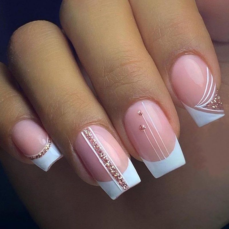 - ANDGING French Tip Press on Nails White Square Short Medium Fake Nails with Gel Coffin Glue Glue on Nails with Glitter Gold Line Striped Design Acrylic False Nails Manicure Stick on Nails for Wedding