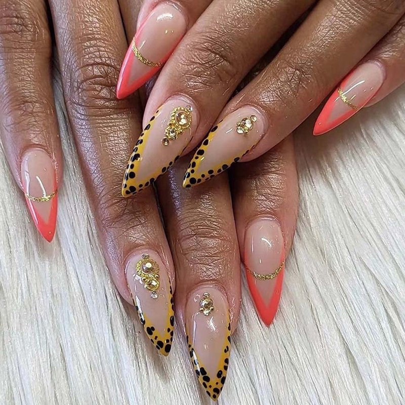 ANDGING Leopard Almond Press on Nails Short Medium French Tip Stiletto Fake Nails Glue on Nails for Women with Yellow Rhinestone Design Cute False Nails Stick on Nails for Wedding Birthday 24Pcs