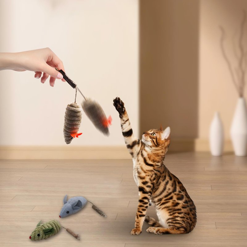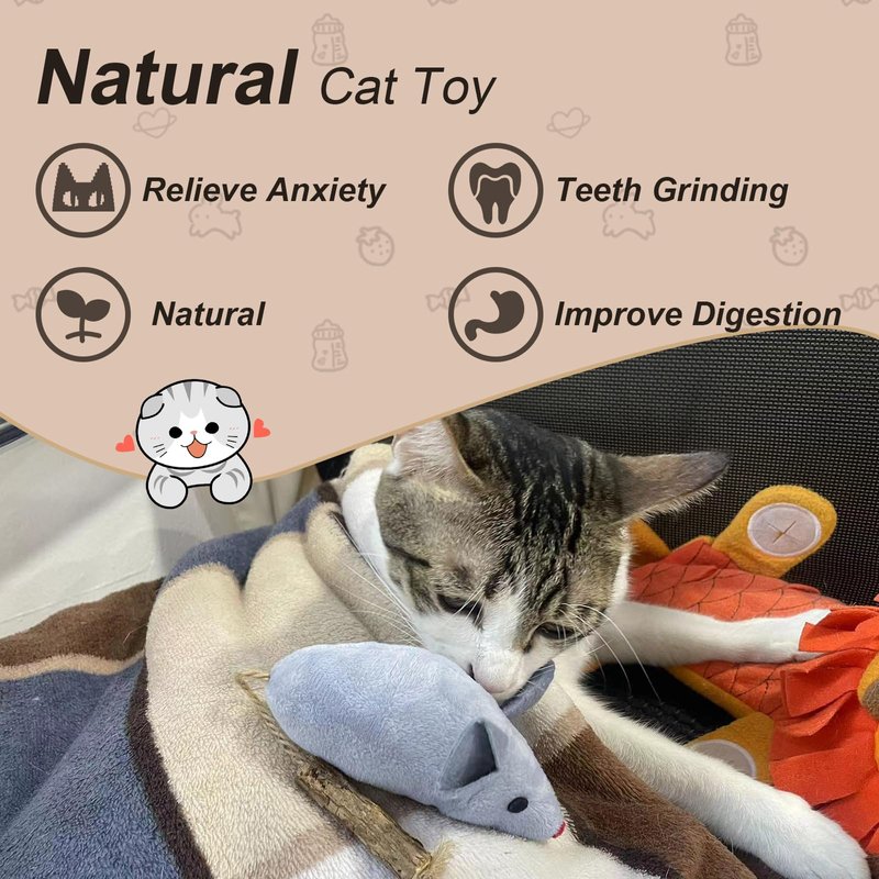 - Catnip and Silvervine—Strong Attraction to Cats: Cats are crazy about the scents of catnip and silvervine. There is catnip inside the cat mice toy, and the tail is made of hemp rope and silvervine, which can attract cats and make your cats active and energetic
