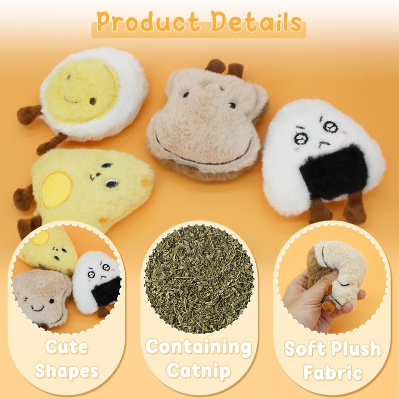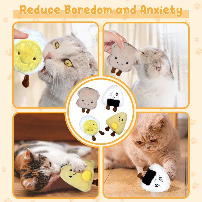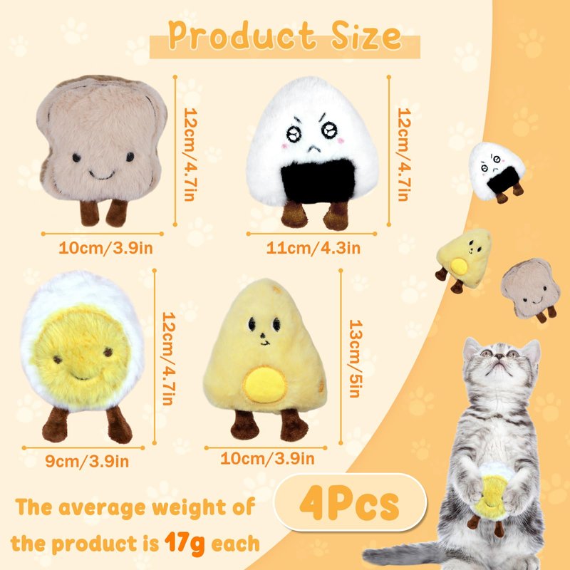 - Creative and Lovely Design: Those cat plush toys are in 4 different shapes, including poached egg, sliced bread, cheese slice and triangle rice ball. Those vivid and unique shapes can effectively draw cats’ attention