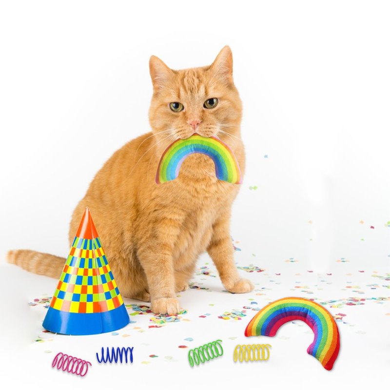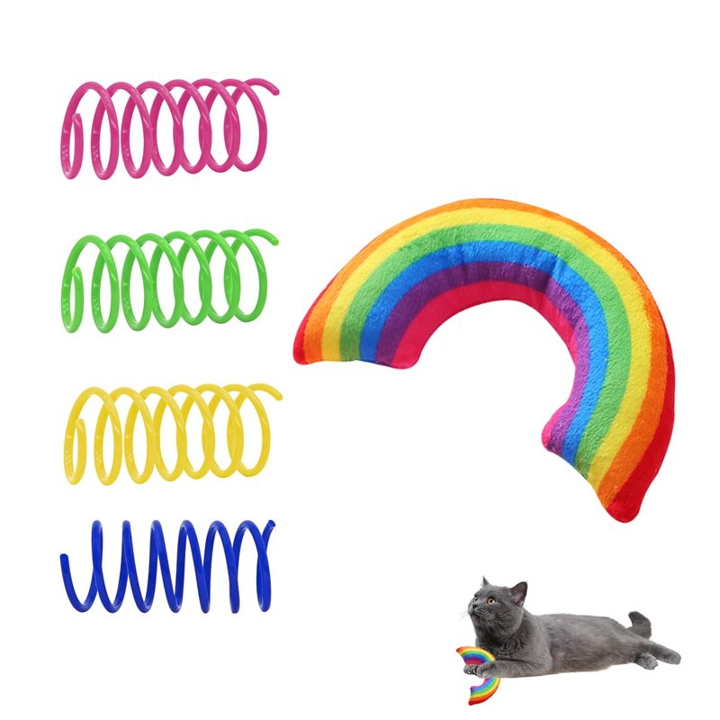 Andiker Catnip Toy&4pcs Cat Spring Toys, Colorful Plush Rainbow Pet Pillow, Cat Chew Toy for Kitten Scratch, Bite and Hug, Interactive Cat Toy for Indoor Cats to Smooth Mood and Relax (Darker)