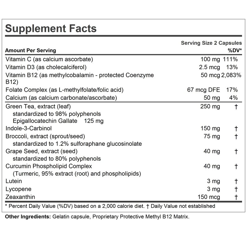 - SUPERIOR Pure BIO-ACTIVE INGREDIENTS – Delivers Green Tea extract, Indole-3-Carbinol, Broccoli extract, Grape Seed, Curcumin, Lutein, Lycopene, Zeaxanthin, Vitamin C, Vitamin D, Calcium and B Vitamins. Contains NO Milk / Dairy-Free, Gluten-Free; NO soy, yeast, wheat, sodium, salt, sugar, fat, cholesterol, color, preservative or manufacturing additives.