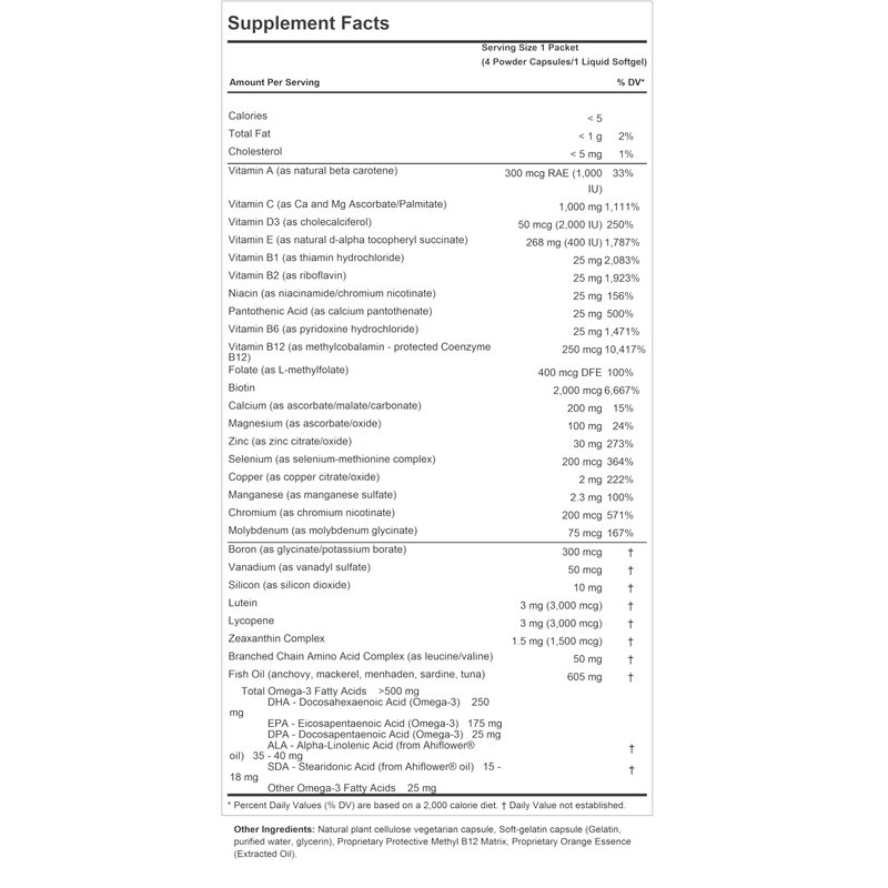 - SUPERIOR 100% PURE BIO-ACTIVE INGREDIENTS – Provides high potencies of all essential vitamins, minerals and carotenoids, including Vitamin A, vitamin C, Vitamin D3, Vitamin E, B-complex vitamins, Calcium, Magnesium, Zinc, Selenium, Copper, Manganese, Chromium, Molybdenum, Boron, Vanadium, Silicon, Lutein, Lycopene, Zeaxanthin Complex, Branched Chain Amino Acid and 500 mg Omega-3 Fatty Acids. Contains NO Milk / Dairy-Free, Gluten-Free; No Additives of Any Kind.