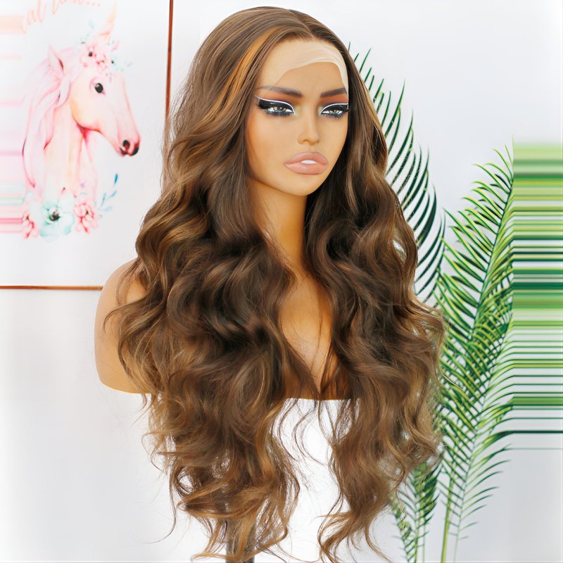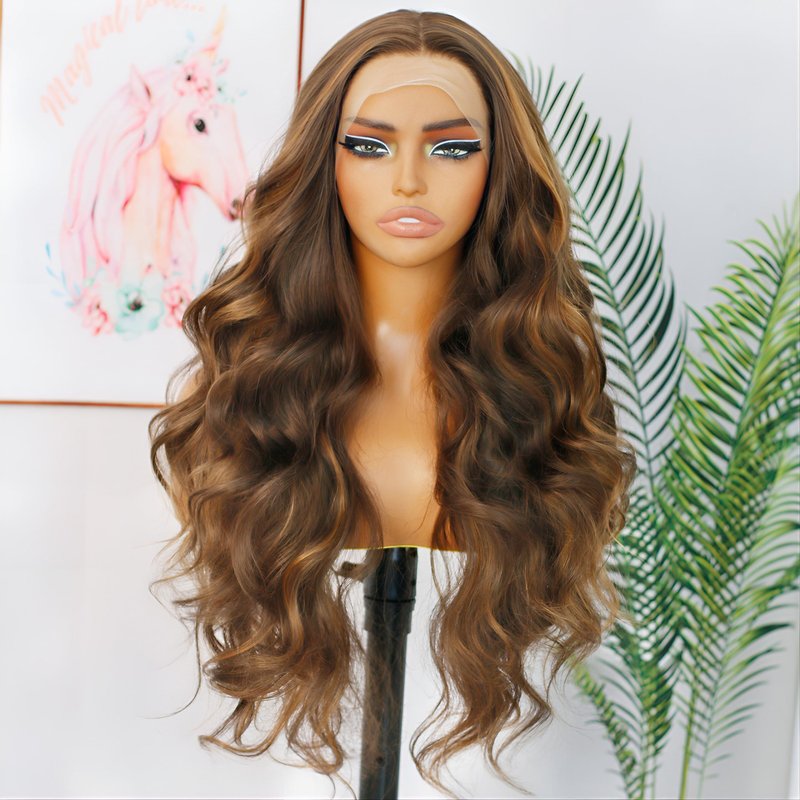 ANDRIA Highlight Brown Lace Front Wigs Long Body Wave Glueless Natural Wave Transparent lace Wig Synthetic Heat Resistant Fiber Hair Wig Pre Plucked With Baby Hair For Women 24 Inch