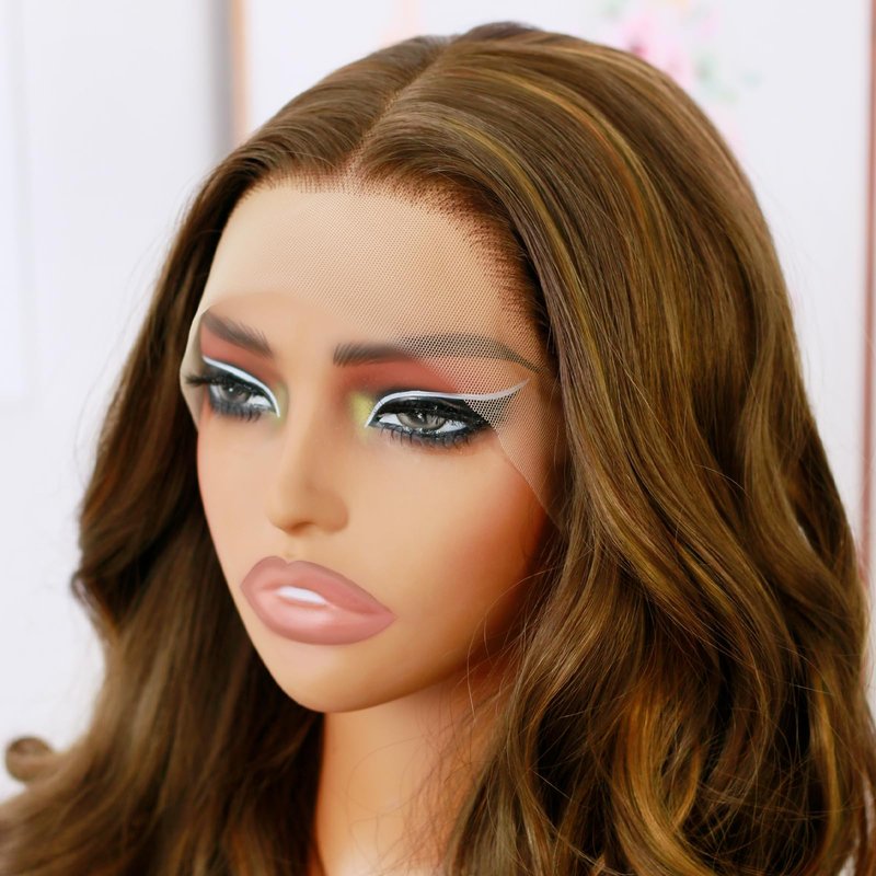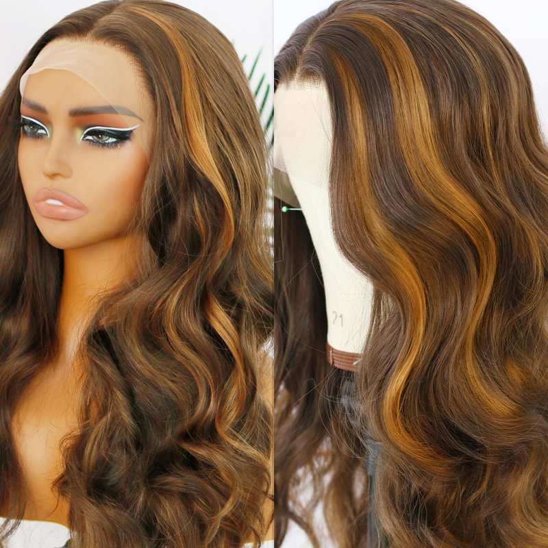2.Hair Color: Chocolate Brown Mixed Blonde Highlight Skunk Stripe Lace Frontal Wig