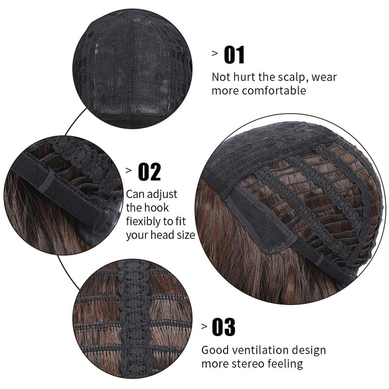 - Cap and Cap Size: This short curly wig with bangs fit most head sizes and shapes.The breathable rose net cap inside has a strap on both sides that can adjust the length freely to adapt to different head sizes, which make you feel comfortable when you wear it.
