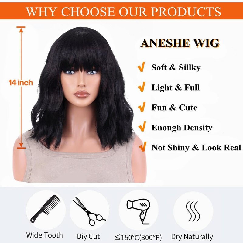 AneShe Short Wavy Black Bob Wig with Bangs Natural Black Curly Wigs for Women Shoulder Length Wig Heat Resistant Synthetic Fiber Wig for Party Daily Use