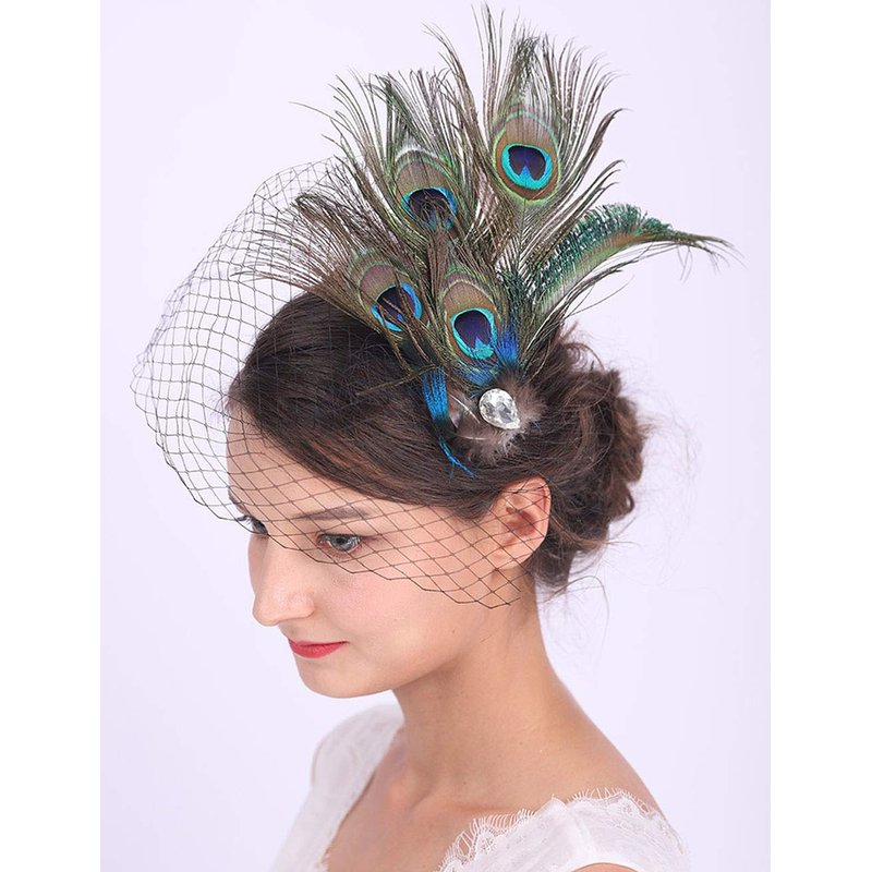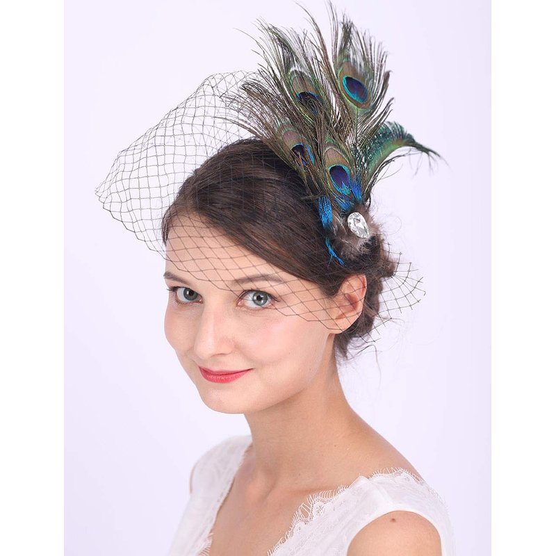 Anglacesmade Bridal Feather Hair Clip with Black Veil Peacock Feather Fascinator Bridal Short Veil for Wedding Prom Festival Party 20s Flapper Headpiece for Women and Girls