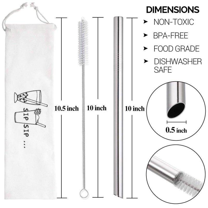 2 Pcs Angled Tips Extra Wide Stainless Steel Bubble Tea Straws and Smoothie Straws Best size and length for Bubble Tea(Tapioca Pearl), smoothies, milkshakes, jumbo drinks and more homemade beverages Refuse plastic straws and save the earth PACKAGE INCLUDED: 2 pcs stainless steel straws with angled tips 1 pcs straw brush 1 pcs straws travel bag SIZE: Straws: 10" long and 0.5" wide Brushes: 10" long Bag: 10.5" long MATERIAL: Premium 100% food-grade 304 stainless steel. DISHWASHER SAFE and will not rust NOTE: 1 - Washing these reusable straws in hot water before first use 2 - Adult supervision is required when used by children under 12 years old 3 - Don't use it in moving car