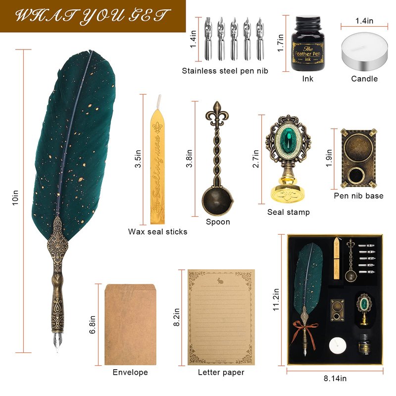 - ‽ WHAT YOU GET: Feather calligraphy pen set included 1 wax seal stamp, 1 ink, 1 wax seal stick, 5 different size replacement nibs, 1 spoon, 1 envelope, and 1 letter paper, 1 white wax, all-in-one feather quill set is the best gift for friends and family.