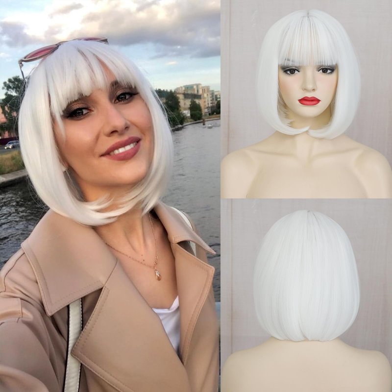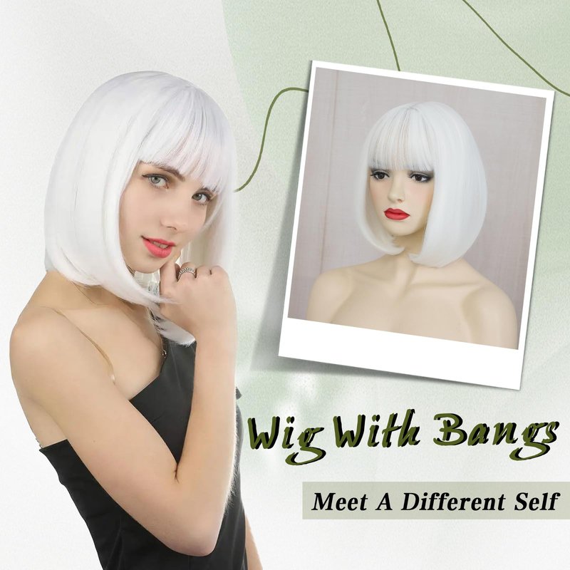 Angzon White Bob Wigs with Bangs Short Straight Bob Wigs For Women Shoulder Length Synthetic Bob Wigs For Halloween Daily Party Cosplay