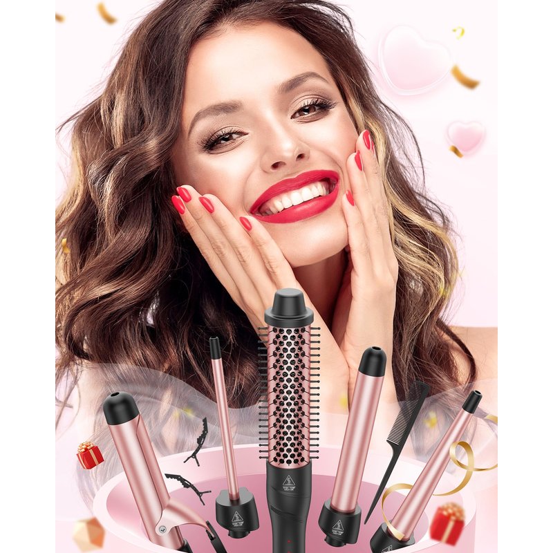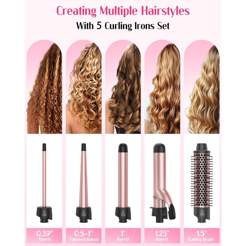 - [Versatile Styling]: ANIEKIN 5-in-1 Curling Iron Set includes 4different sizes of interchangeable ceramic Curling Irons and a Curling Brush to meet all your styling needs. (It includes a 0.39 inch small curling iron for tight curls;a 0.5-1 inch tapered curling iron for natural waves;a 1-inch curling iron for classic large curls; and a 1.25-inch curling iron and a 1.5-inch curling brush for voluminous and smooth hairstyles.)