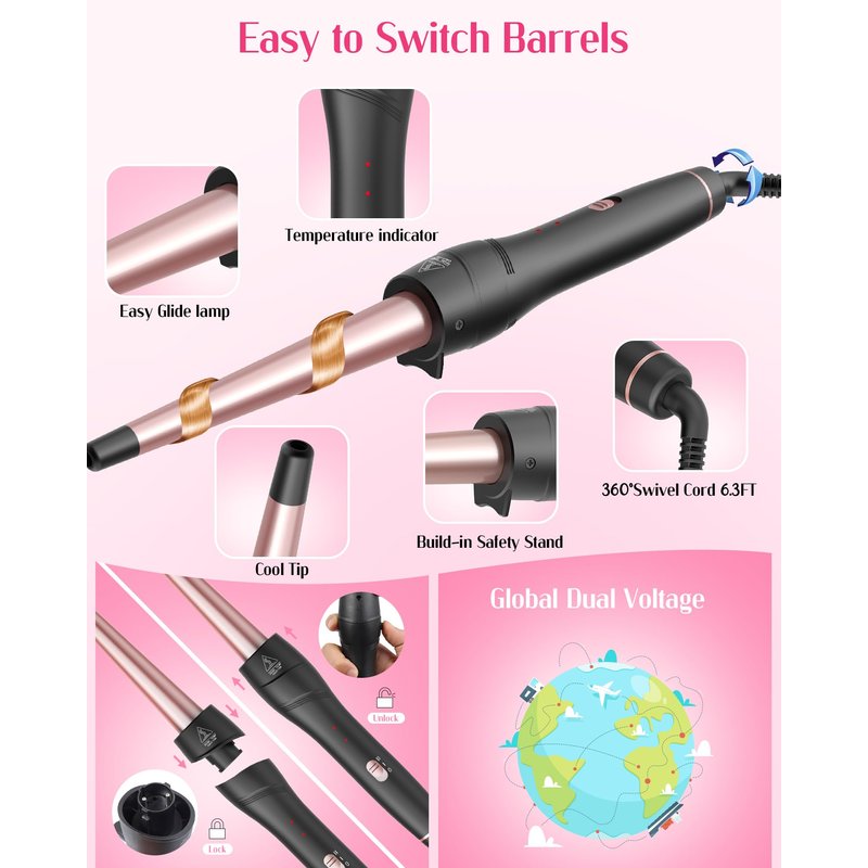 - [Ceramic Barrel]: Curling iron with interchangeable handle design. You can easily change different sizes of Curling Wand to create different curling hairstyles. Scald resistant tips and heat-resistant gloves can protect your hands from the heating bucket.