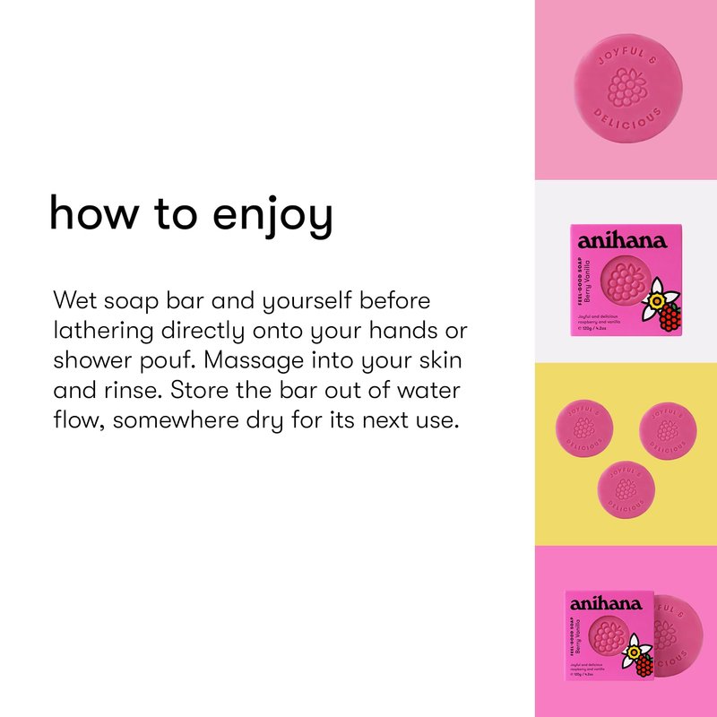 - VIBRANT SCENT: Anihana Berry Vanilla Feel-Good Soap delivers deliciously sweet, candy-like scents of fresh raspberries and rich vanilla to bring a smile to every wash