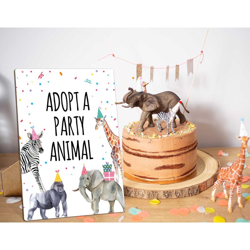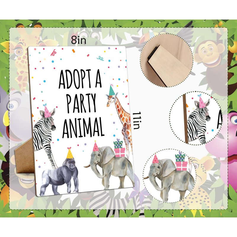 Animals Birthday Party Signs, Adopt A Party Animal, 8×11 Wooden Play Sign with Stand, Safari Birthday Decorations, Safari Birthday Party Favors, Animal Birthday Party Decorations - LP077