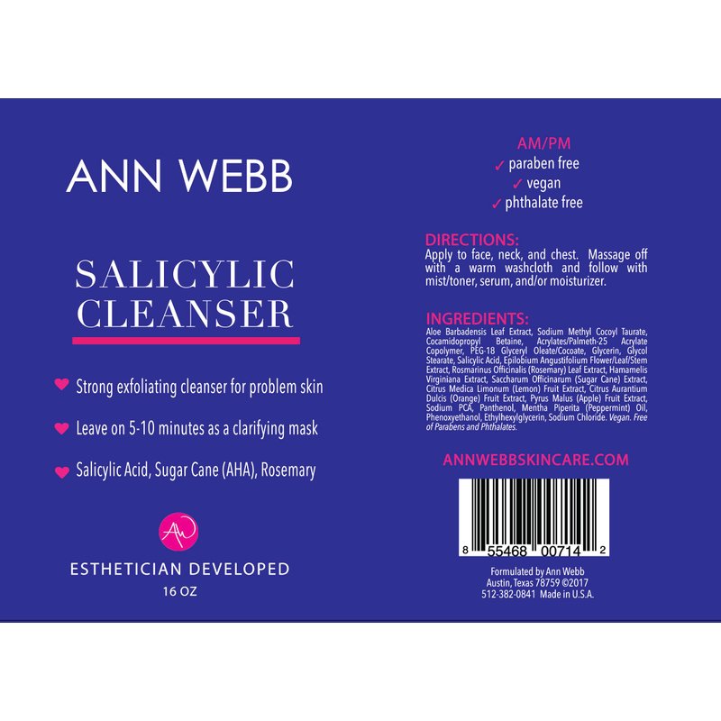 - ANN WEBB Skin Care Salicylic Gel Cleanse is great for stubborn skin issues. Leave it on to use as an acne fighting face mask. A strong yet gentle foaming face wash that effectively removes excess oils and reduces blackheads and blemishes. Infused with salicylic acid, this cleanser exfoliates to loosen and remove dead skin cells, helping to clear up acne and oily-prone skin while leaving it feeling refreshed and hydrated.