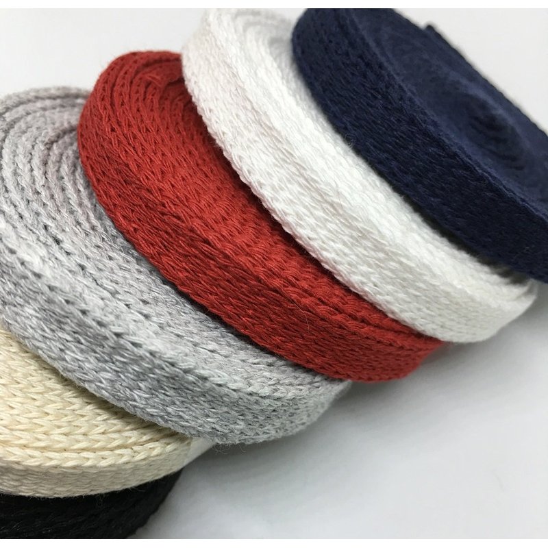 3/8" COTTON FLAT CORD. PRETTY PATTERN. AVAILABLE IN 3, 5, OR 10 YARDS IN BLACK, WHITE, NATURAL, RED, NAVY, AND HEATHER GREY.