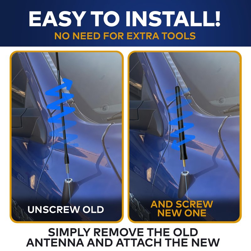 - STYLISH SOLUTION FOR YOUR VEHICLE - Our car antenna replacement allows car washes and all-season use without worries. Due to its coating material, size, and form, this short antenna is resistant to water, dust, heat, freezes, wear and tear. No loud wind noise compared to long factory-style antennas.