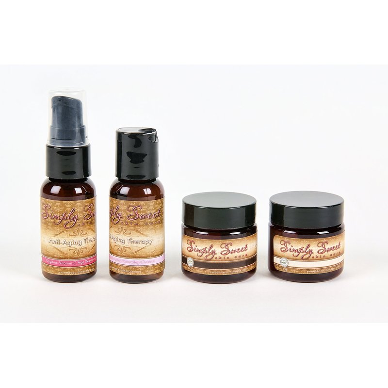 Simply Sweet Skin Care presents: Organic Anti-Aging Skin Care Kit Beautiful, healthy, younger looking skin starts here! Lift, firm, and smooth your skin with risk-free results, not invasive measures. Gently cleanses and calms skin while improving firmness and elasticity. This comforting treatment kit is loaded with vitamins and prepares your skin to receive the maximum benefits from the products that follow. Works well on all skin types: Normal, Oily or Combination. Renewing Cleanser: Our Organic Anti-Aging Renewing Cleanser gently yet aggressively removes oil, dirt, make-up and surface impurities from the skin. More than just skin care, Simply Sweet skin care products offer the secret to defying age beyond procedures for skin that acts and looks years younger. Vitamin C Age Repairing Toner: This multi-vitamin, age repairing facial Toner is specially formulated to help tone, protect, defend and renew environmentally damaged skin. Use Toner to complete the cleansing process while balancing skin pH levels - for instantly softer, smoother, younger-looking skin. High in Vitamin C, most of our advanced anti-aging and/or reconstructive skin care regiment recommendations include this powerful, all-natural product. This Organic Vitamin C Age Repairing Toner balances and prepares skin to receive the maximum benefits from the products that follow.