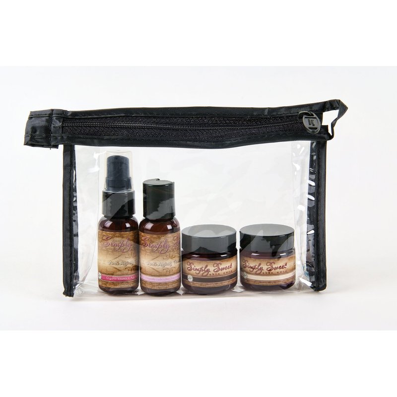 Simply Sweet Skin Care presents: Organic Anti-Aging Skin Care Kit Beautiful, healthy, younger looking skin starts here! Lift, firm, and smooth your skin with risk-free results, not invasive measures. Gently cleanses and calms skin while improving firmness and elasticity. This comforting treatment kit is loaded with vitamins and prepares your skin to receive the maximum benefits from the products that follow. Works well on all skin types: Normal, Oily or Combination. Renewing Cleanser: Our Organic Anti-Aging Renewing Cleanser gently yet aggressively removes oil, dirt, make-up and surface impurities from the skin. More than just skin care, Simply Sweet skin care products offer the secret to defying age beyond procedures for skin that acts and looks years younger. Vitamin C Age Repairing Toner: This multi-vitamin, age repairing facial Toner is specially formulated to help tone, protect, defend and renew environmentally damaged skin. Use Toner to complete the cleansing process while balancing skin pH levels - for instantly softer, smoother, younger-looking skin. High in Vitamin C, most of our advanced anti-aging and/or reconstructive skin care regiment recommendations include this powerful, all-natural product. This Organic Vitamin C Age Repairing Toner balances and prepares skin to receive the maximum benefits from the products that follow.