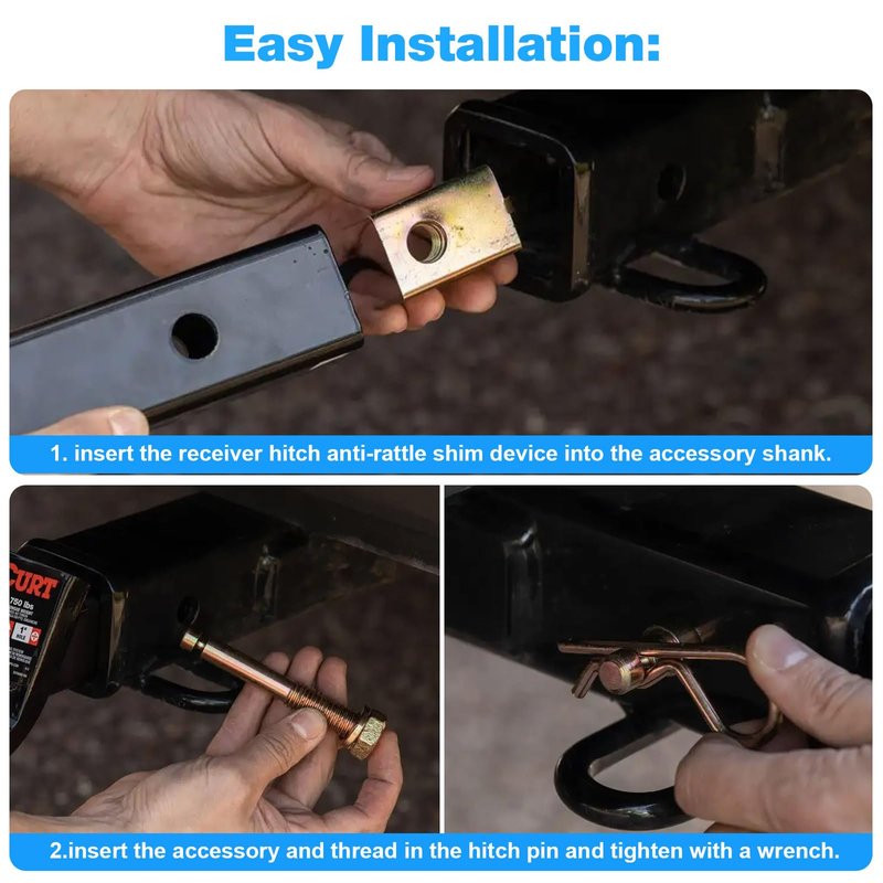 - 【Easy Installation】Simple and quick .1. insert the receiver hitch anti-rattle shim device into the accessory shank. 2.insert the accessory and thread in the hitch pin and tighten with a wrench.