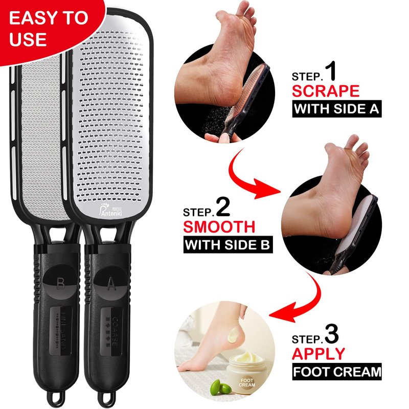 - Simple and easy for new users. Step 1 - Use side A (the coarse file) to scrub the rough, dry skin; Step 2 - Twist to side B (the fine sand file) to pedicure and smooth around the area. Step 3 - Apply some foot cream and cover with socks. Warm remind: Please move up and down slowly and gently.