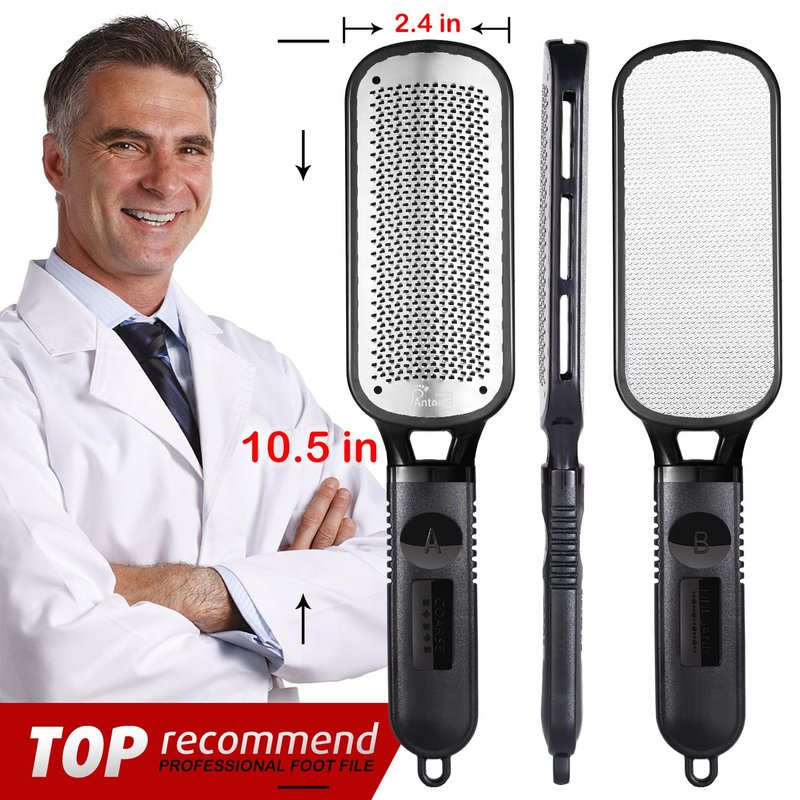 - The stainless steel blade of this pedicure rasp foot filer is skin-friendly but effective to get it work of feet scrubbing. The sturdy plastic handle has a depression for the thumb which makes it firm to hold and use. The design have hollow core on side of foot grater which let scrubbed skin fall off directly. ( Please rinse it under running water and keep it dry.)