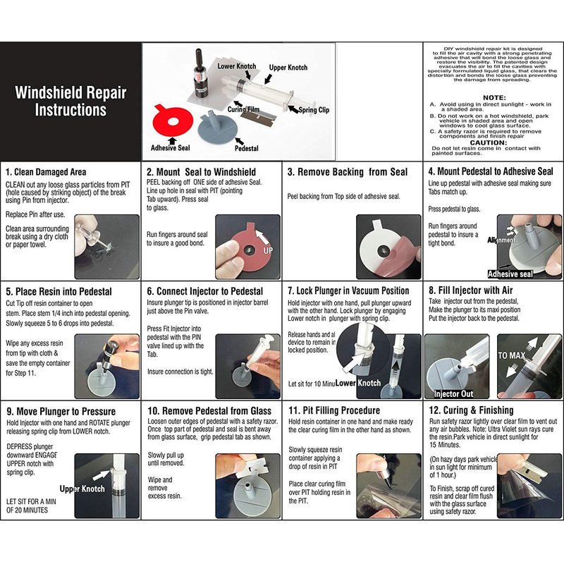 - Easy to operate: This windshield repair kit is easy to use, allows anyone make permanent air-tight repairs on most windshield glass. Our glass repair kit can quickly and effectively repair chips and cracks, bulls-eye, spider web, star-shaped, nicks in 20-30 minutes.