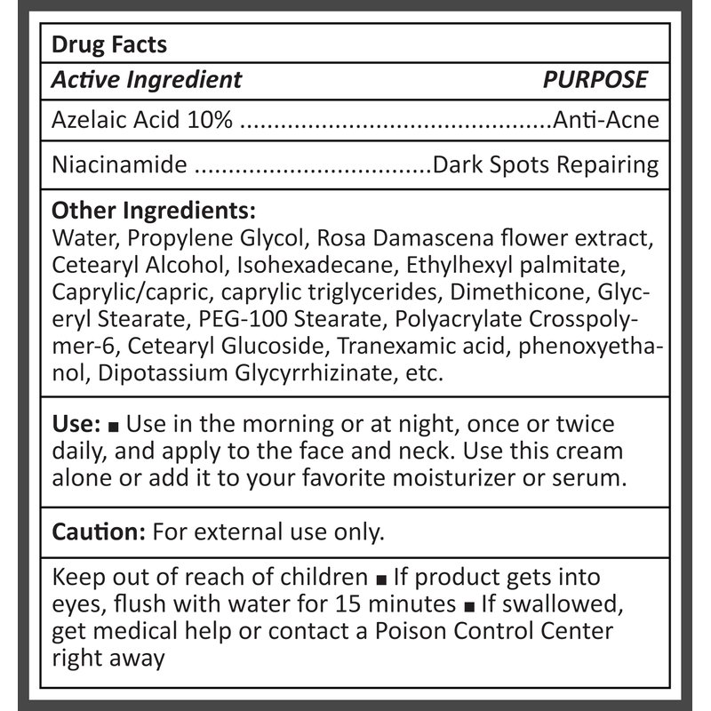 - ✦Fix Skin Discoloration✦ Our 10% Azelaic Acid Cream has good abilities REPAIRING SKIN DISCOLORATION and EVENING OUT THE SKIN TONE. Our azelaic acid cream targets the root causes of skin discoloration. Azelaic acid cream reduces dark spots and azaleic.acid repairs Acne-related scars.