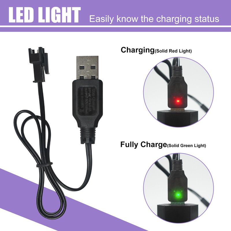- 3.7v li-ion rechargeable battery sm 2p plug USB Charger cable built-in over-charged protection board, it displays a red light when the battery is charged and a green light when fully charged.