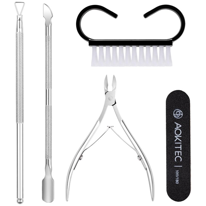 - ποΈ Versatile 5-in-1 Nail Care Tools Kit - Aokitec cuticle remover kit features must-have tools for comprehensive nail care, including a precision cuticle trimmer, dual-end cuticle pusher (featuring both a flat head and a sharp head), a handy triangle nail polish scraper, a durable nail file, and a horn nail dust brush. Everything you need for flawless nails in a single kit.
