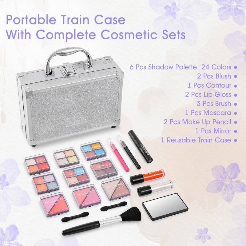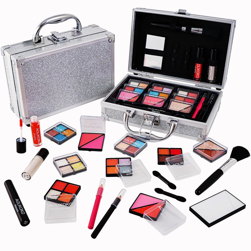 AOLIKOKO Makeup Kit for Teenager & Women Full Kit, All in One Makeup Set With The Small Cosmetic Train Case, Professional Makeup Kit, Makeup Gift Set for Women Girls (silver)