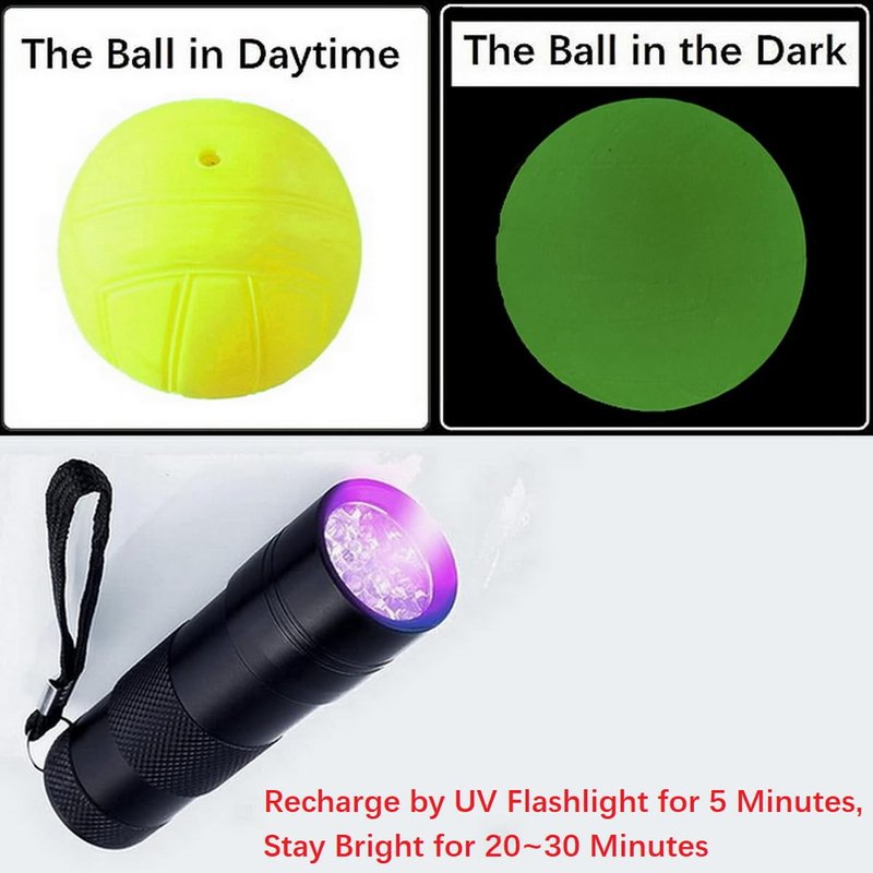 - 【Bright Fluorescent Luminous Replacement Balls, Glow in The Dark - Play at Night】: Enjoy the Trampoline/Roundnet Game/Sports at Nighttime with our Glow in the Dark Balls. They have a Bright Fluorescent Glow and Recharge your Night Ball over and over again by Sunlight or with a UV Flashlight. No battery, No USB cable needed.