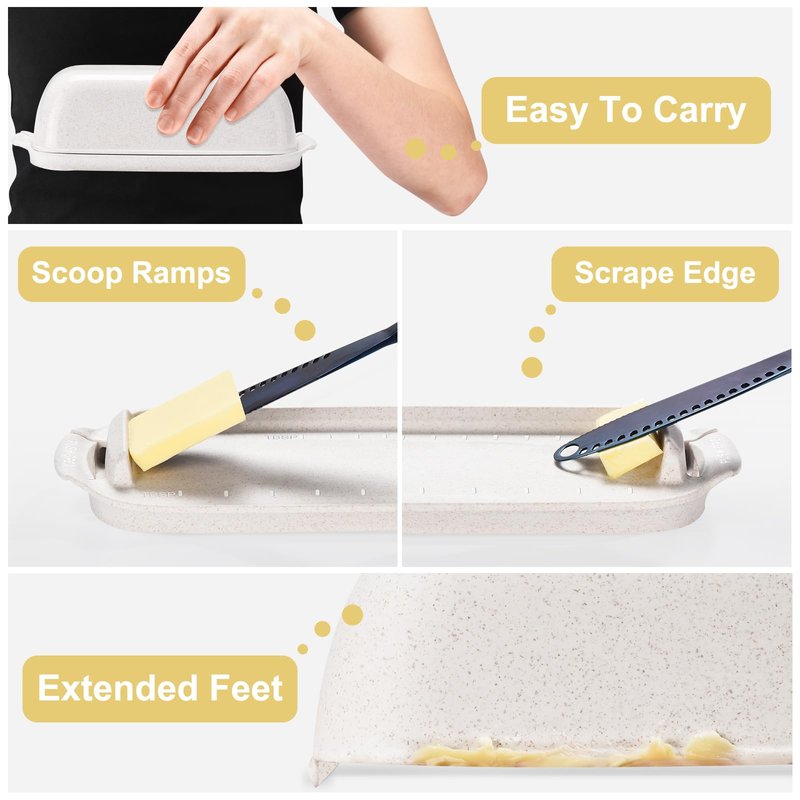 - 【Easy Scoop and Clean】Curved ramps help you and the kids easily scoop up butter; Just slide your knife up the ramp; No more chasing cold butter squares around the tray; The top of the ramps act as a scrape plate to clean your knife and collect butter; tablespoon measurements lines can help you better scoop the butter amount you need