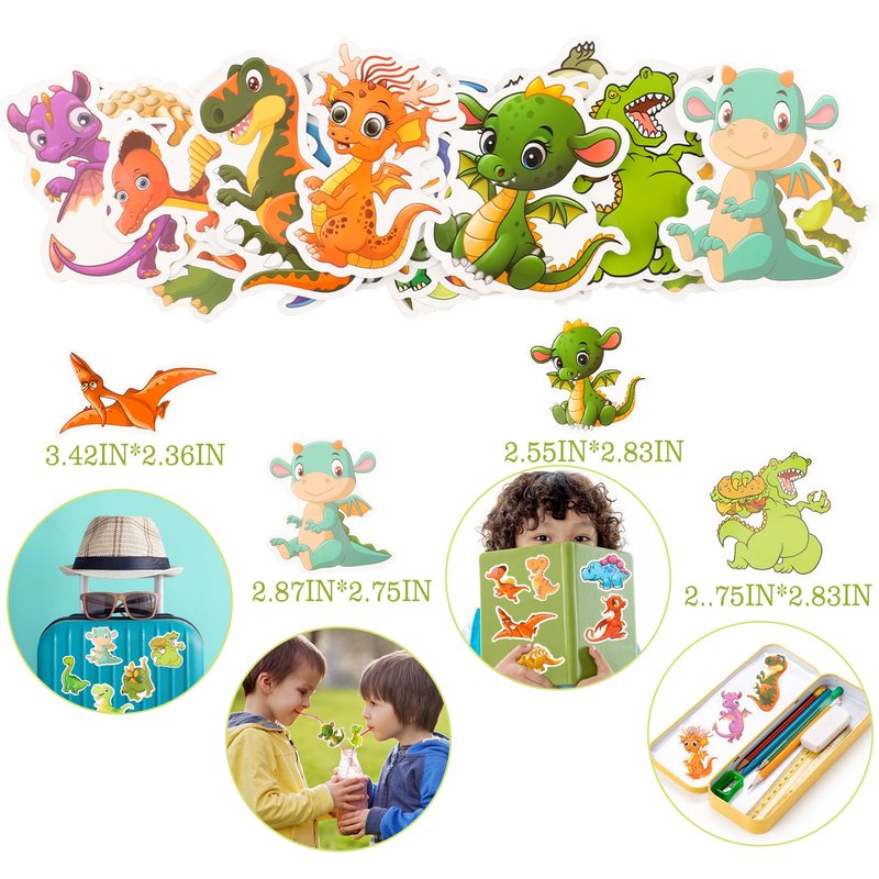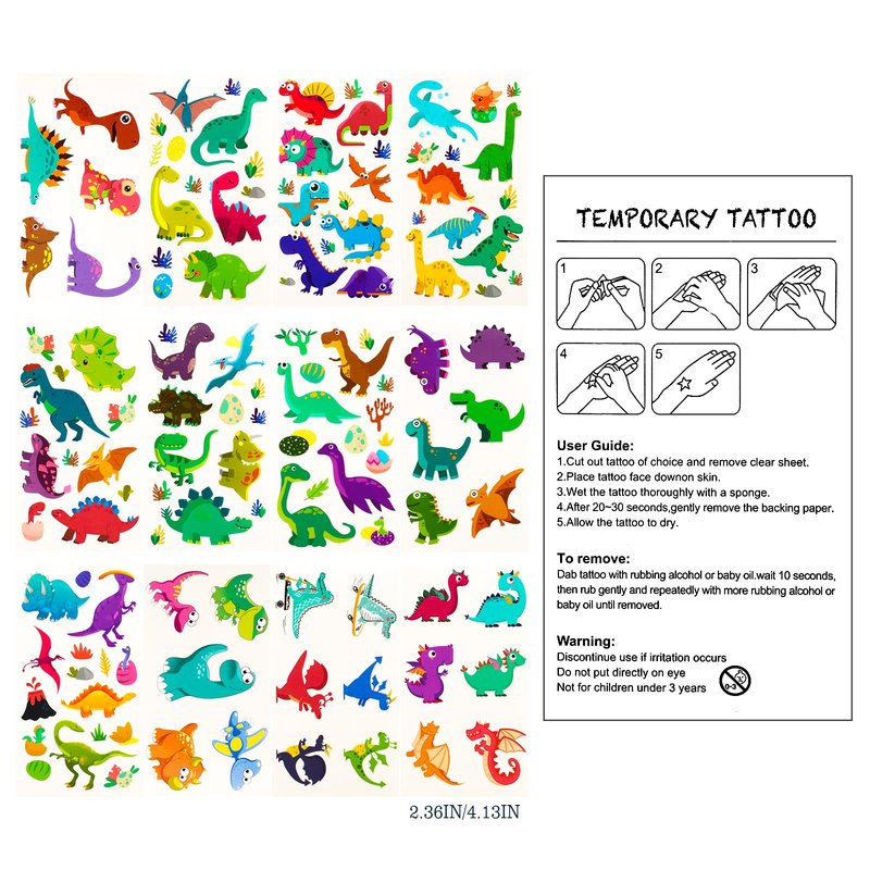 - Dinosaur Party Favor Included - 10pcs dinosaur stamp, 12pcs dinosaur slap bracelets(12 styles), 12pcs dinosaur rings(6 styles), 12pcs dinosaur keychains(6 styles), 12 sheet dinosaur temporary tattoos, 50pcs dinosaur stickers, will be a great hit for kids party favors.