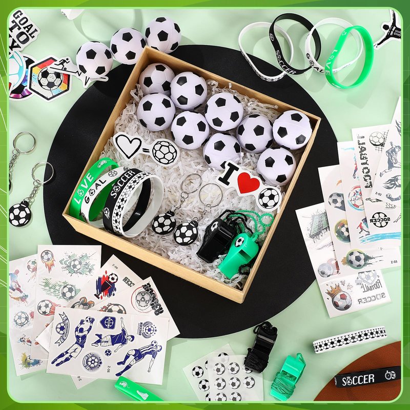 - Soccer Party Favors: there are a total of 108 pieces of soccer party supplies, including 10 sheets of soccer temporary tattoos, 50 adhesive soccer stickers, 12 mini soccer toy, 12 soccer silicone bracelets, 12 whistles, 12 soccer keychains, different items with adequate quantity to satisfy your diverse and soccer party using, decorating and sharing needs