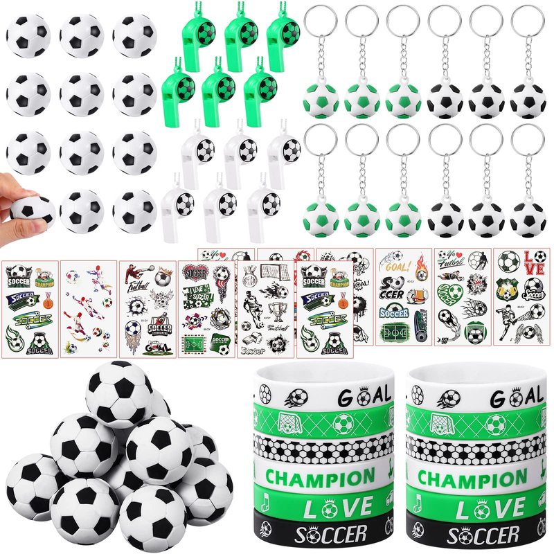 - Party Favors: there are a total of 72 pieces of party supplies, including 12 sheets of tattoos, 12 pieces of erasers, 12 pieces of silicone bracelets, 12 pieces of whistles, 12 pieces of keychains and 12 pieces of mini balls, different items with adequate quantity to satisfy your diverse soccer party using, decorating and sharing needs