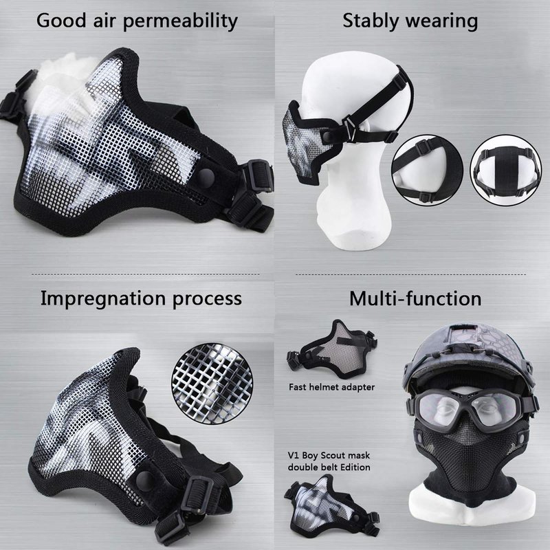 - Package includes: 1 x Steel Mesh Mask for Halloween, 1 x Tactical Goggles. Material:Airsoft Mask:Low-carbon steel and 1000D Nylon. Goggles : TPU+PC.